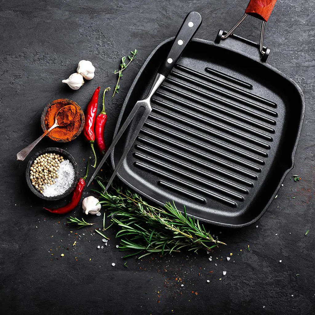 A heavy pan with raised ridges that mimic the effect of a grill, leaving beautiful sear marks on meat and veggies. It’s great for indoor grilling! Fun Fact: The modern grill pan was inspired by outdoor barbecue grills, giving food that classic seared look even when cooked indoors!