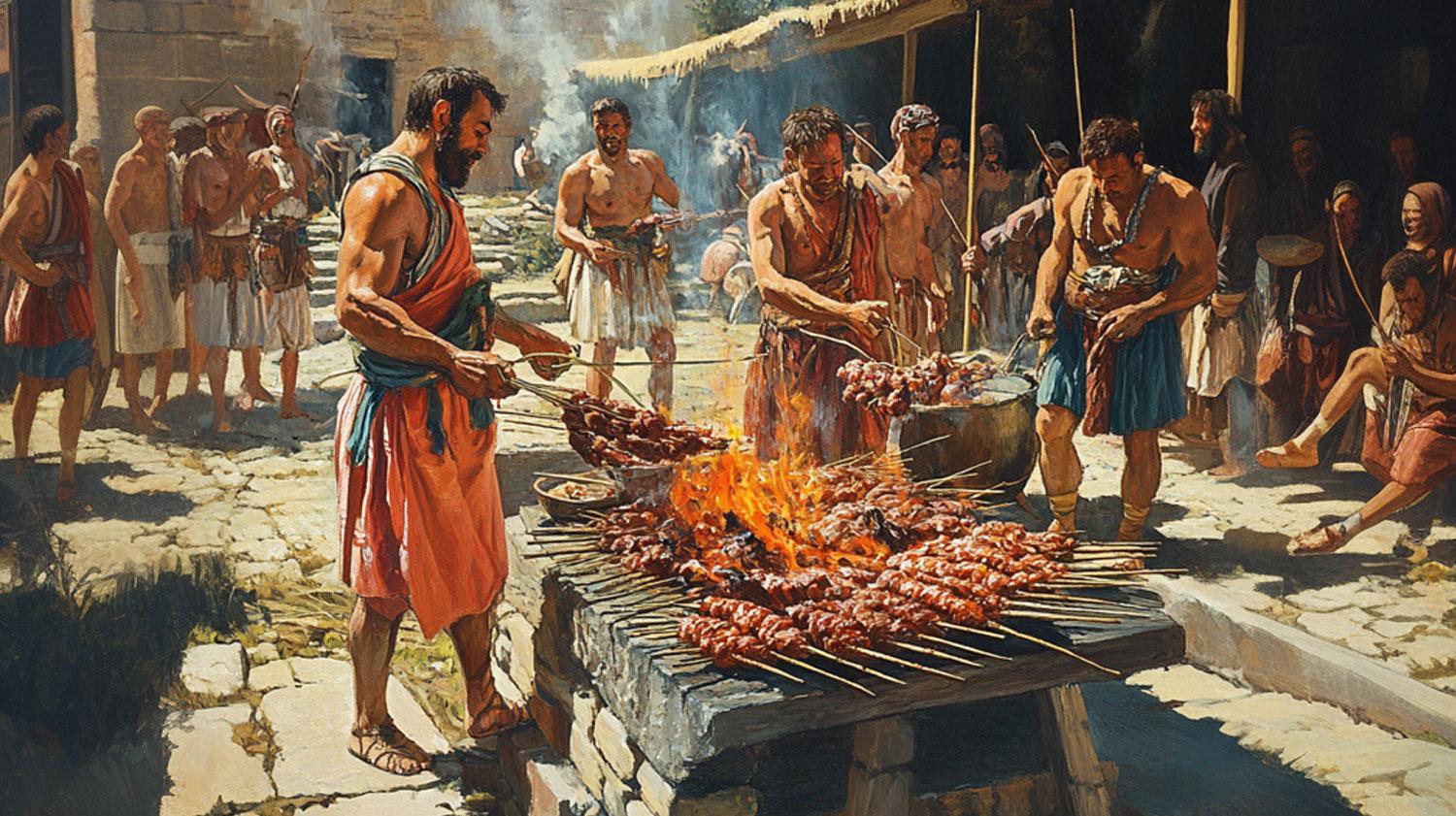 People cooked skewered meat over fire, like today’s souvlaki or shish kebabs!